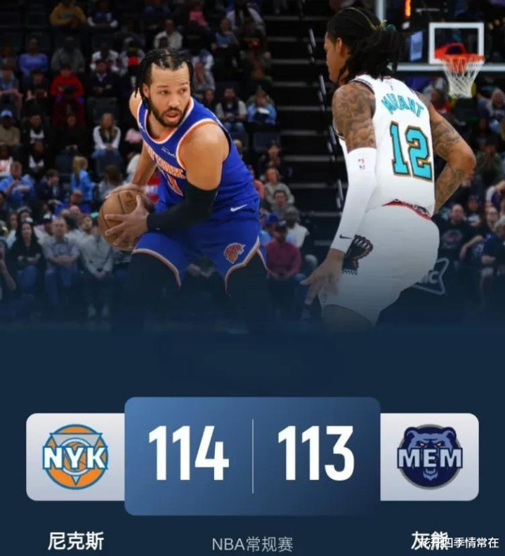 2. 纽约尼克斯 114:113 孟菲斯灰熊: 尼克斯队在与灰熊队的比赛中上演了惊险刺激的末节逆转。 贾马尔·穆雷的伤病再次让尼克斯队暴露了后卫线上的薄弱环节,但RJ·巴雷特稳定的发挥则成为尼克斯克敌制胜的关键。本场比赛,布伦森 (23分7篮板6助攻) 的全面表现,成为尼克斯队获胜的重要基石。灰熊队方面,贾·莫兰特 (25分) 和德斯蒙德·贝恩 (24分12篮板) 的出色发挥为灰熊队苦苦支撑,然而,在关键时刻的把握能力以及防守端出现的一些漏洞,最终让他们输掉了比赛。 这场胜利对尼克斯队的士气提升无疑具有重要意义,也展现了他们在关键时刻的韧性。